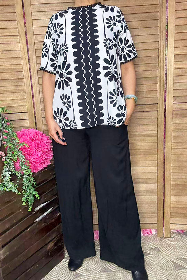Casual Loose Floral Print Pompoms Crew Neck Short Sleeve Women Blouse XCH16717