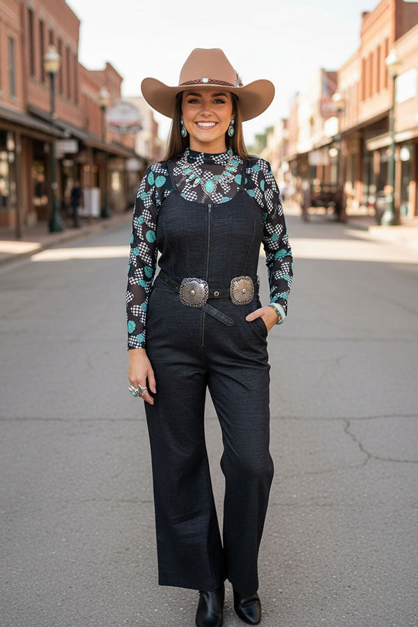 • Overall features wtih denim black stretchy fabric & straight wide legs & zippers at front and elastich gathering at back side, adjustable strap, side pockets.