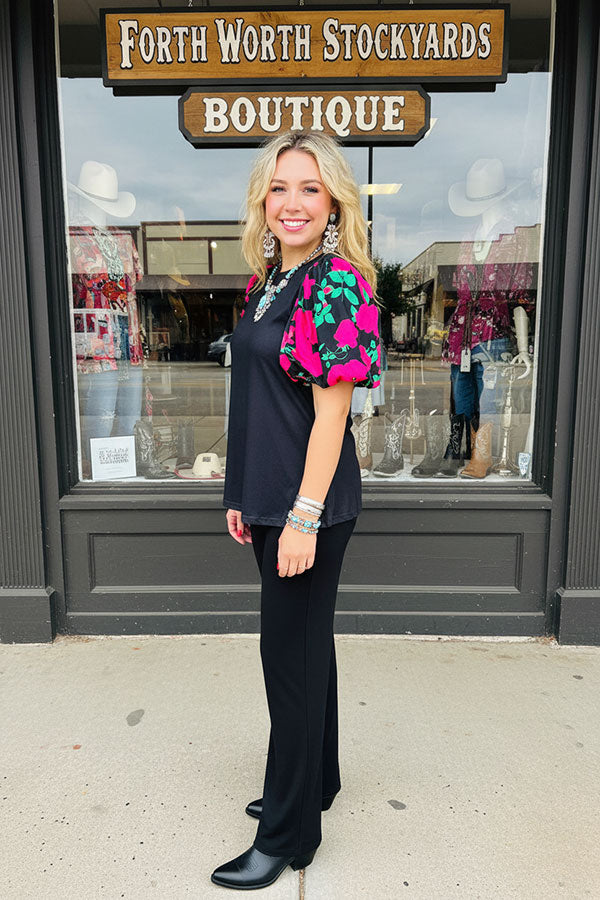 - Top features with fuchsia & green floral printed puff short sleeves & black body color.