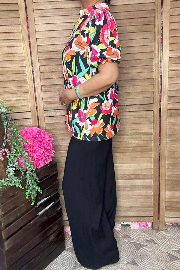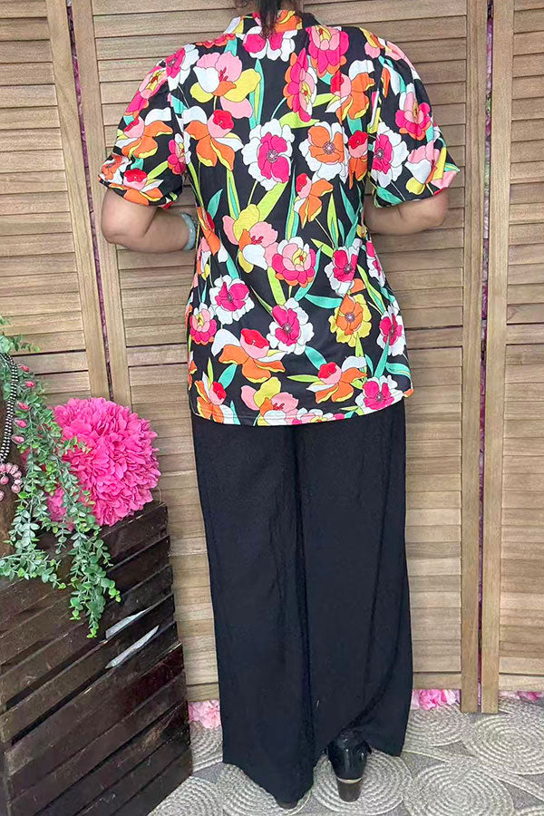 - Top features with multicolor floral printed with puff short sleeves and v-neckline.