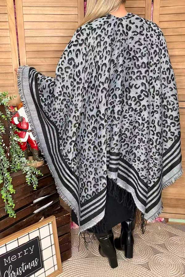 Grey & black leopard knitted women shawl w/tassels & fringe LW11392