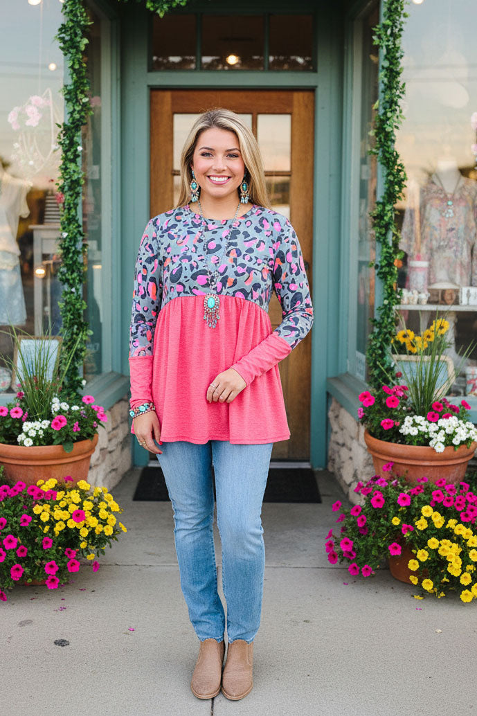• Top features with grey & pink leopard printed with pink baby doll styles & long sleeves.