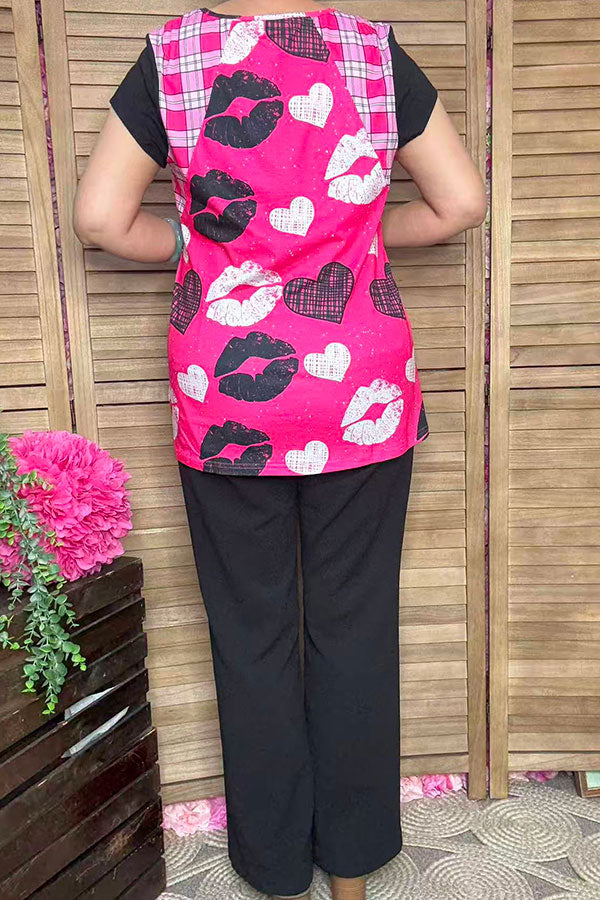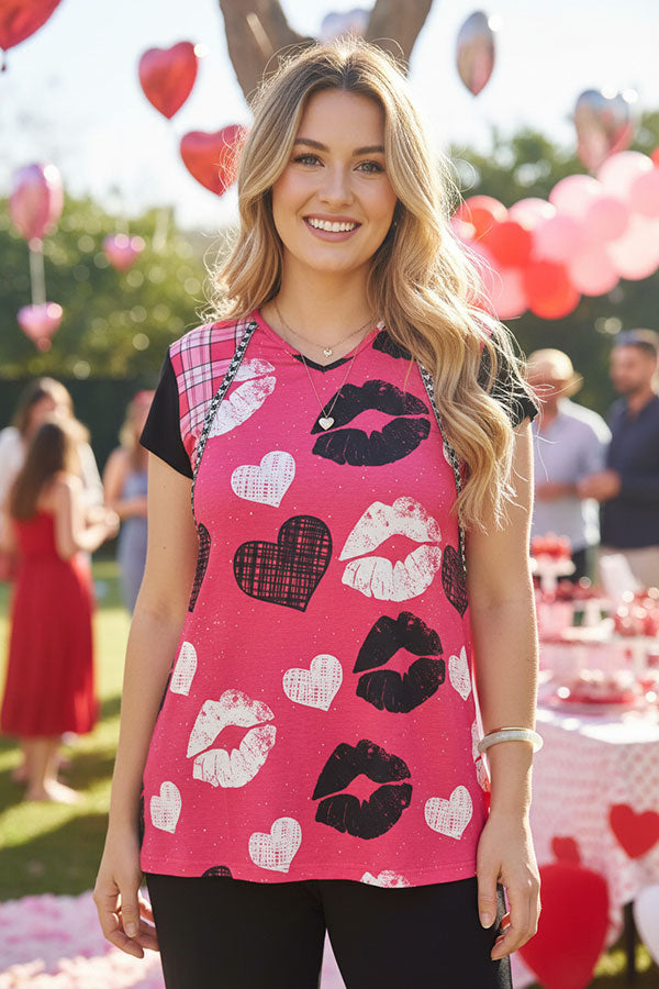 • Top features in hearts & lips printed on hot pink background w/ checkered and black short sleeve.