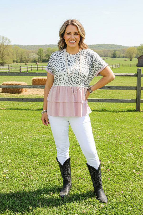- Top features with leopard printed & light pink block with short sleeves.
