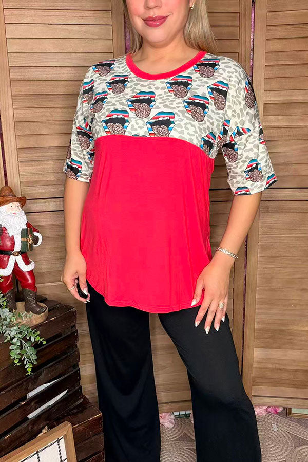 - Top features with mouths leopard printed & red color block with short sleeves.