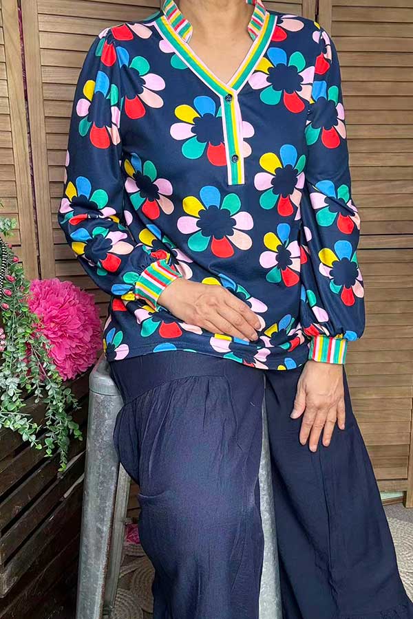 - Top features with multi color flower printed on navy blue background with striped ruffle V-neckline & cuff, buttons at front.