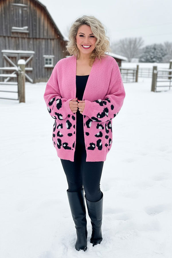 - Cardigan features with knitted leopard on pink background with long sleeves & short open style.
