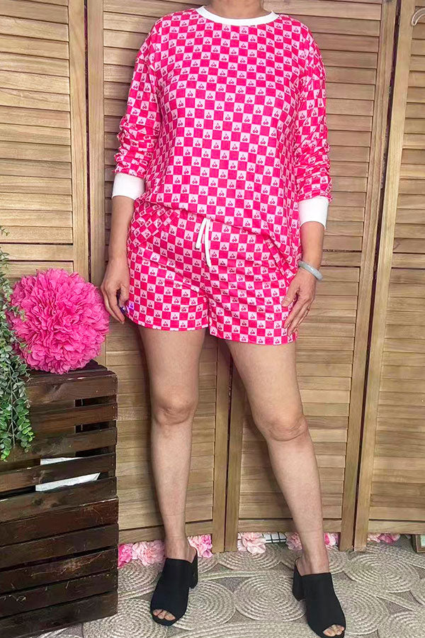 Southern Stitch checkered & cherry printed long sleeve top & shorts 2pc women's set XCH17039