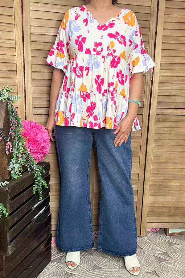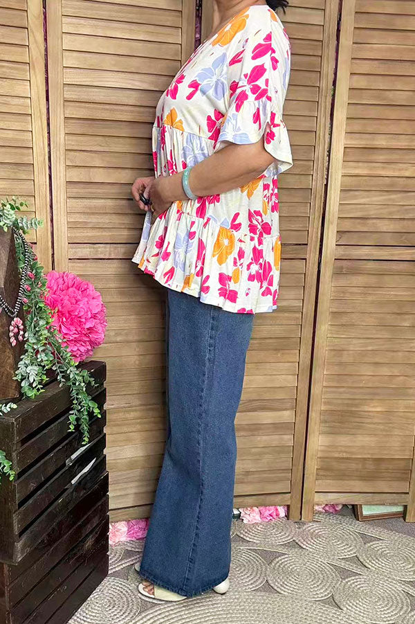 - Top features with pink/yellow/blue floral prints on cream background & ruffle bell short sleeves & v-neckline & baby doll styles.