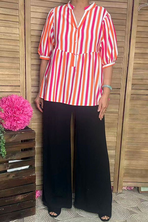 - Top features with fuchsia striped with baby doll style and short sleeves.