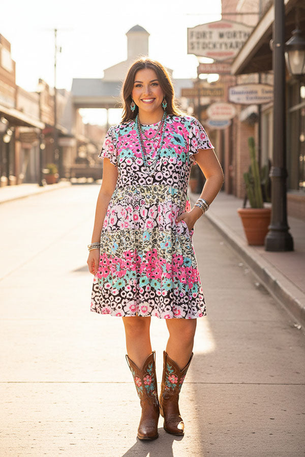- Dress features with pink & mint & black floral printed with short sleeves and side pocket.