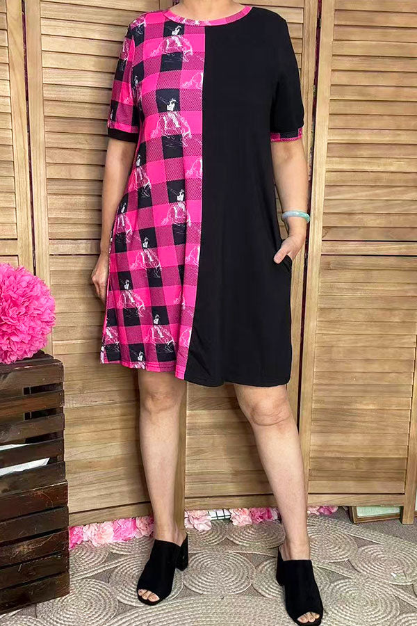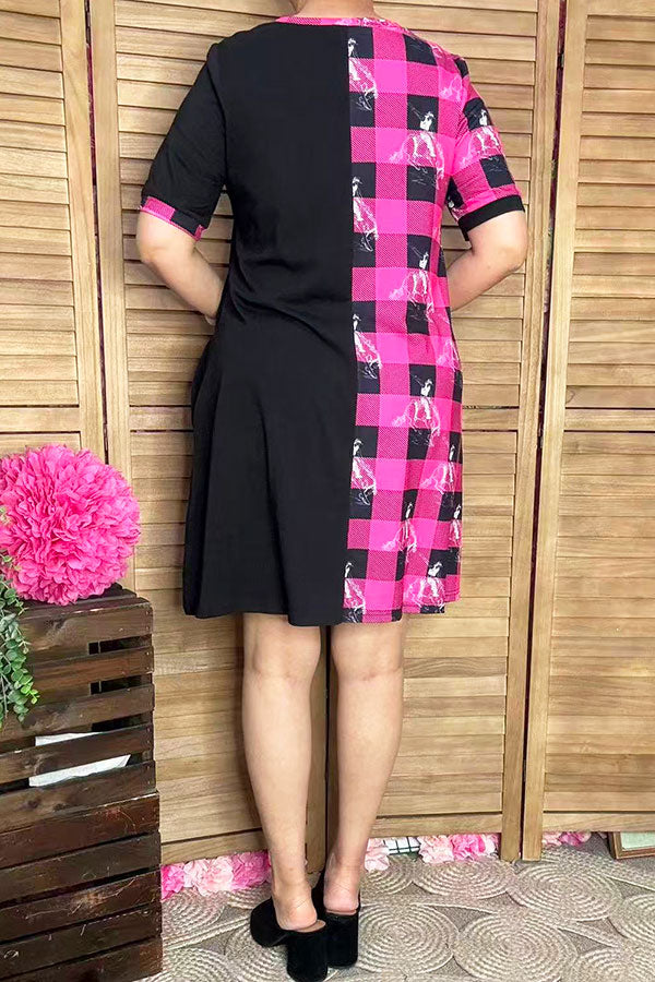 • Dress features with half western cowboy & pink checkered printed with black color block & short sleeves & side pockets.