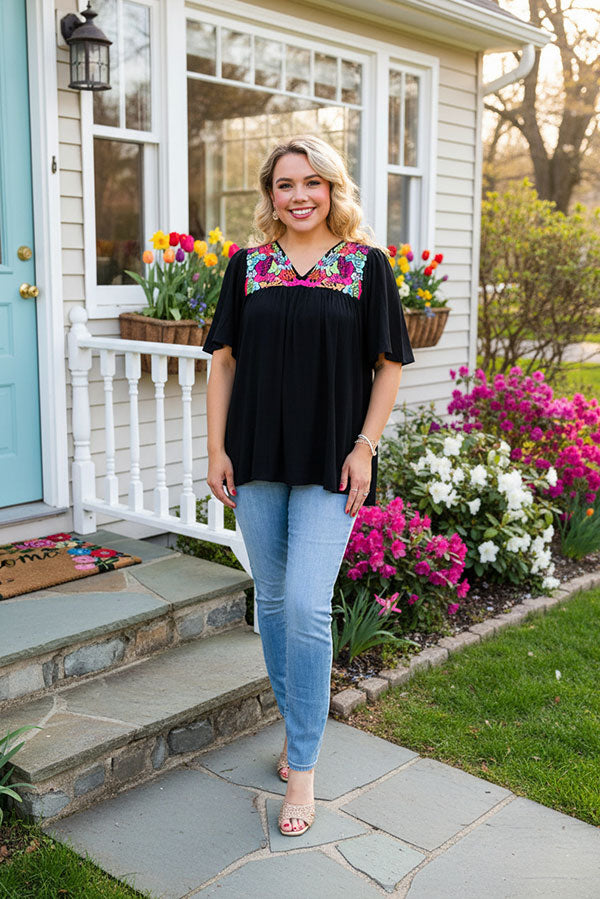 - Top features with black ragon fabric with multi color floral embroidery & bell short sleeves & v-neckline.