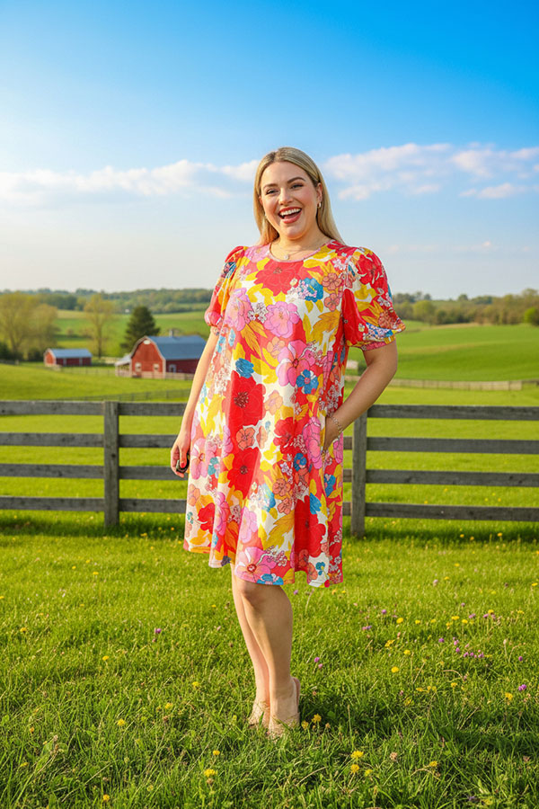 • Dress features multi color floral prints & puff short sleeves & side pockets.