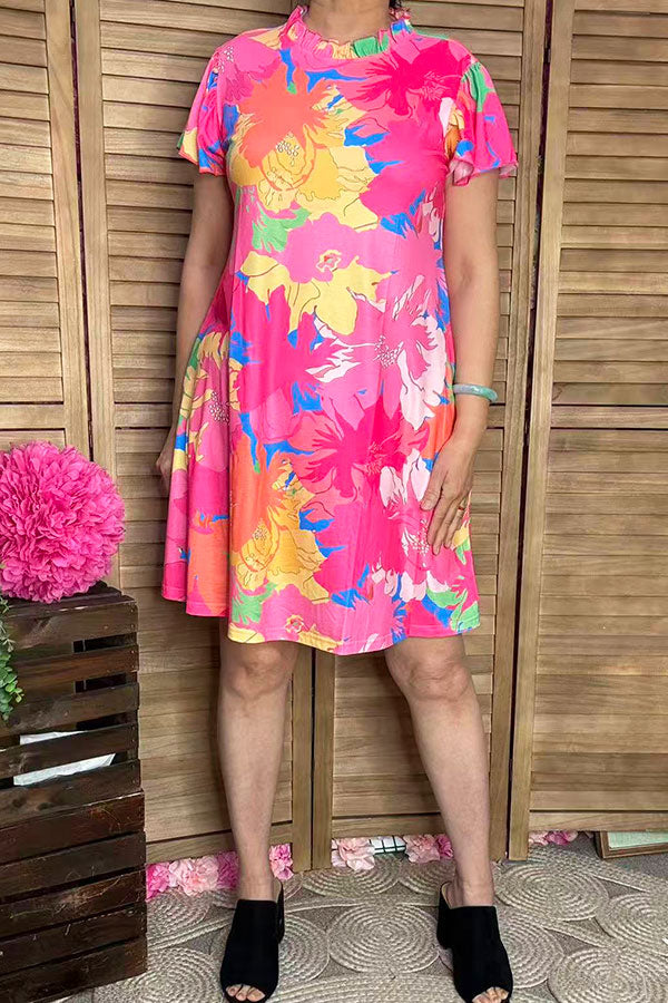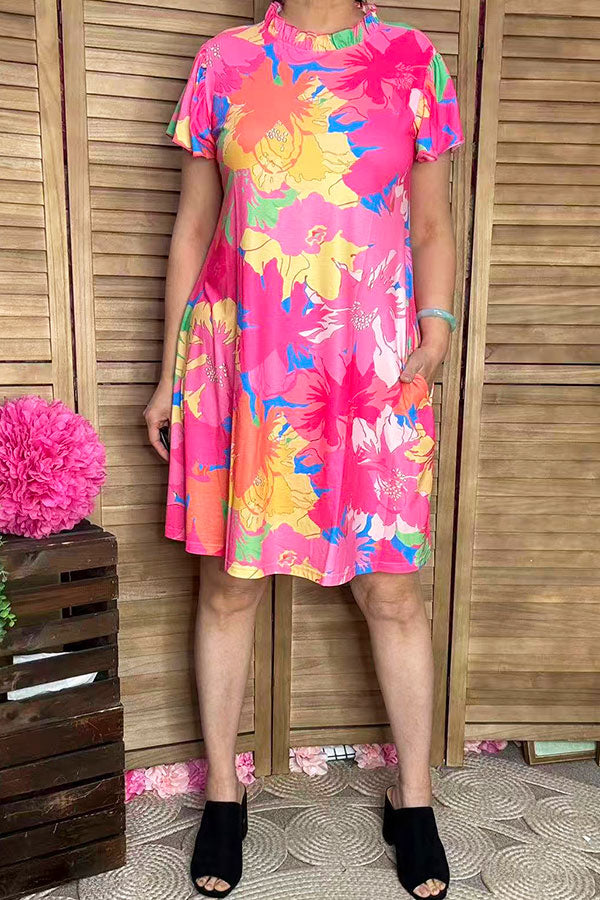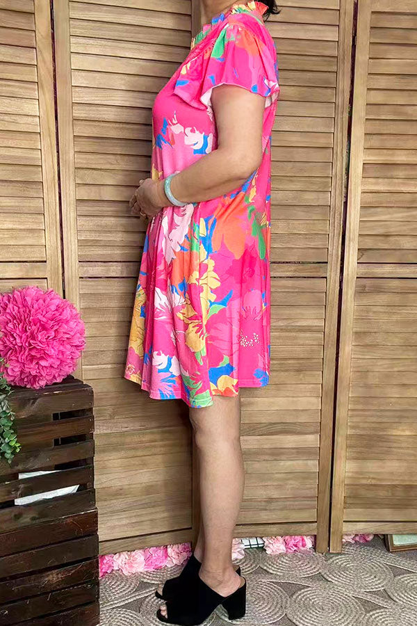 • Dress features with hot pink floral printed with ruffle short sleeves and side pockets.