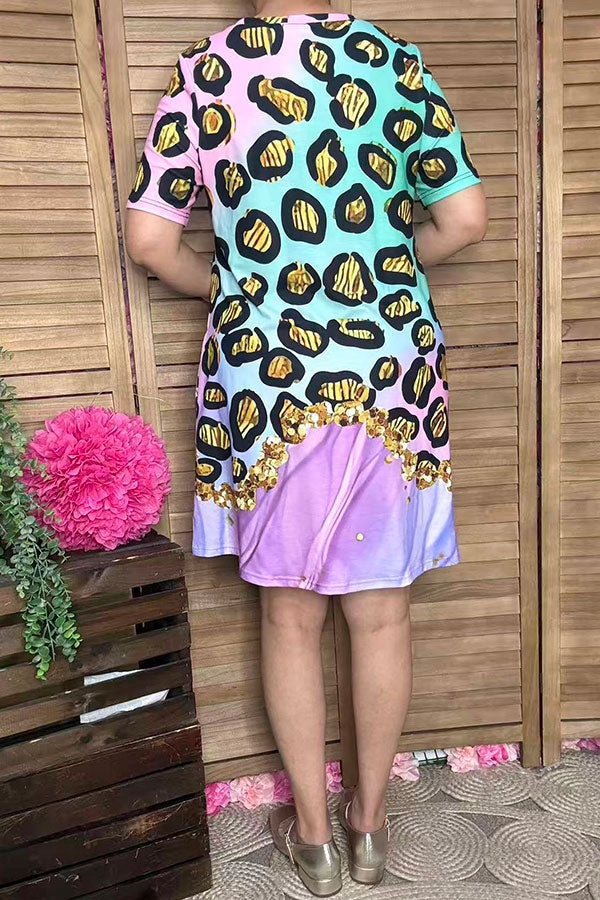 • Dress features with golden leopard on color blend backgorund with short sleeves and pockets for women's boutique clothing wholesale.