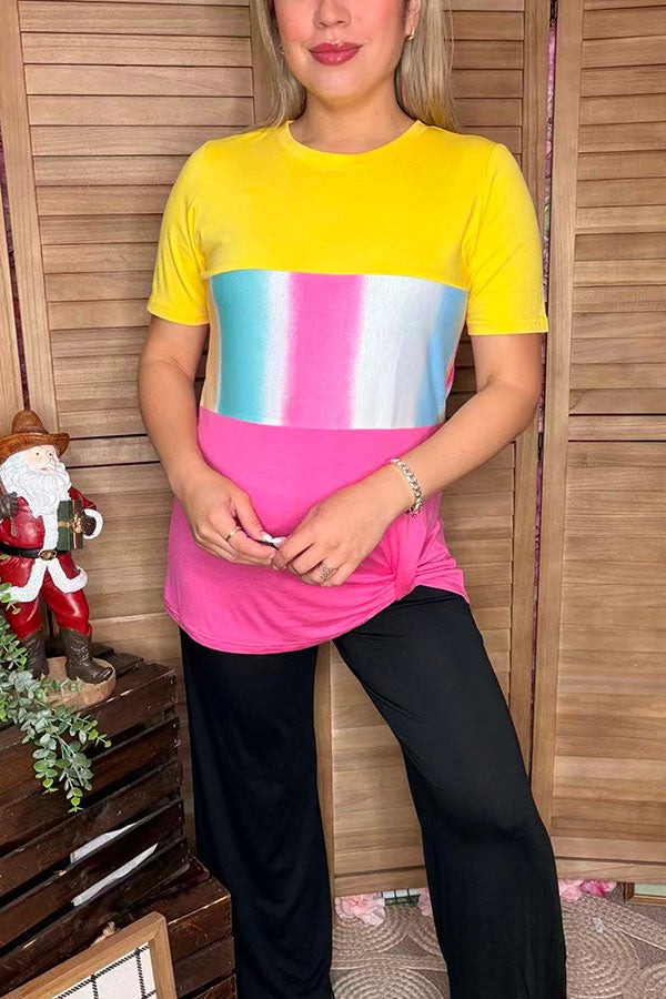 Yellow/pink & multi color block printed short sleeve top w/knot GJQ8707-2 (es7)