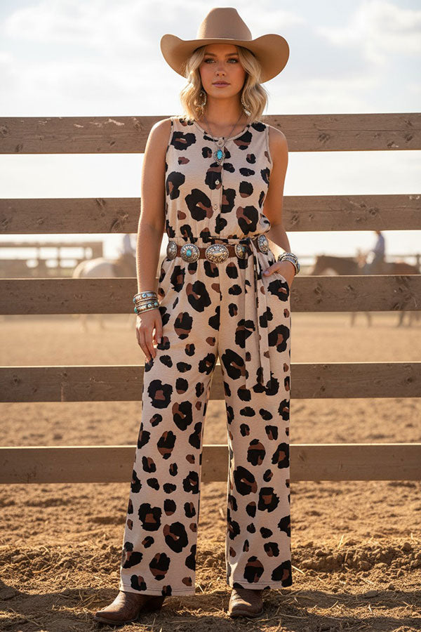 - Jumpsuit with Leopard prints with waistband and pockets, V-neckline and buttons at front.