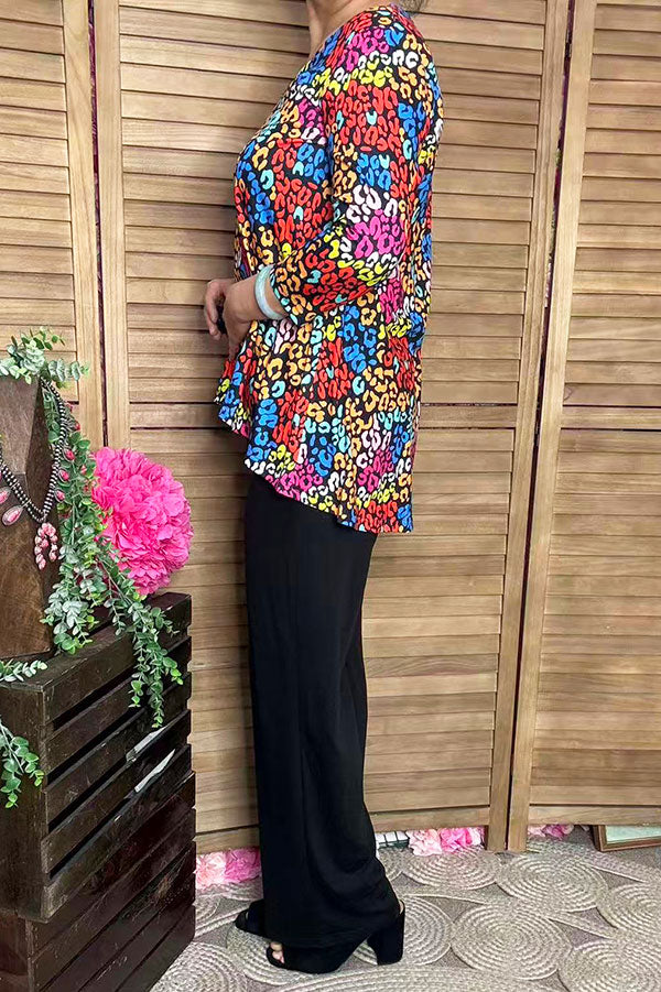 - Top features with multi color leopard printed with 3/4 sleeves and V-neckline.
