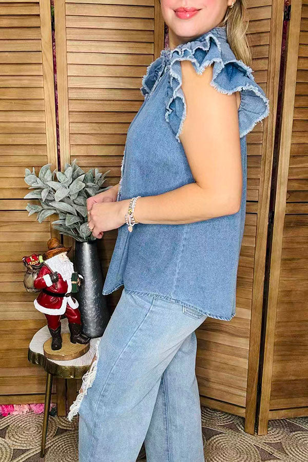 • Top features with denim blue fabric & double ruffle flutter short sleeves & fringe and buttons up.