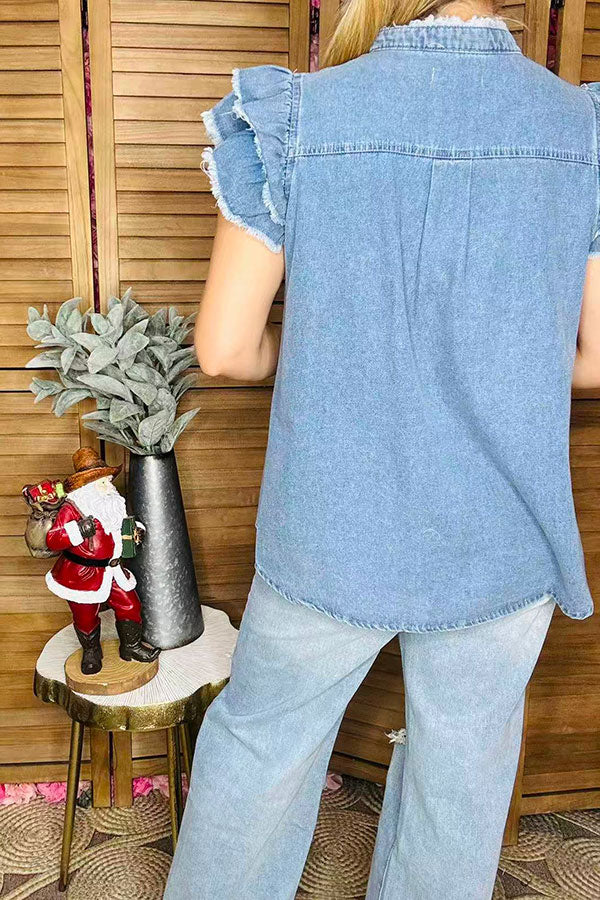 Denim blue flutter short sleeve fringed women top w/buttons up XCH165522