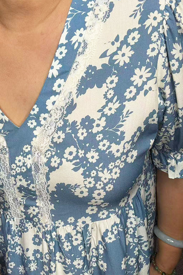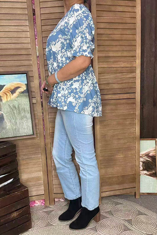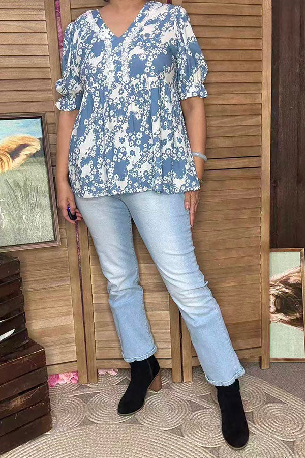 - Top features with white floral printed on blue background with puff short sleeves & elastic cuff & white lace trim at V-neckline.