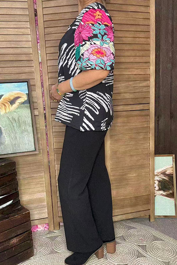 - Top features with flower emboridery on black patterns background with puff short sleeves.