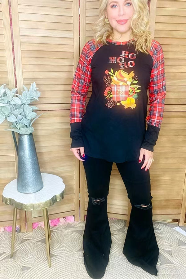 - Top features with HO HO HO Cute cup of tea printed on black background with plaid long sleeves.