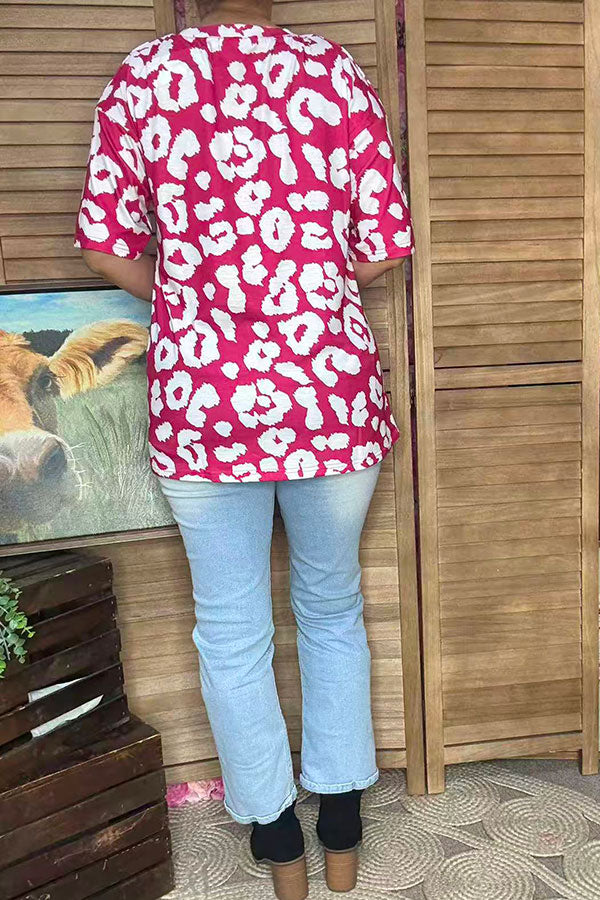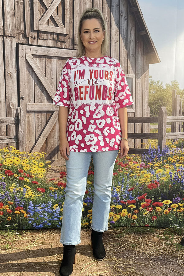- Top features with I'M YOURS no REFUNDS printed on red leopard background with short sleeves.