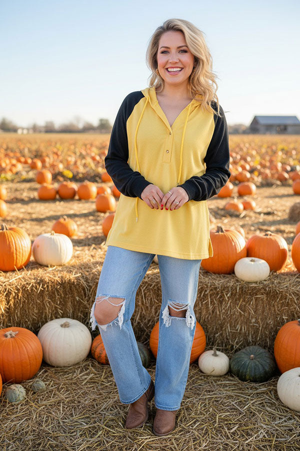 - Top features with knitted waffle fabric yellow & black color block fabric hoodie w/string and long sleeves.
