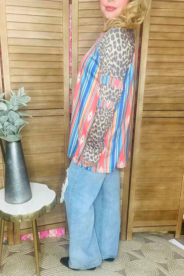 - Top features with multi color serape top w/leopard printed long sleeves.