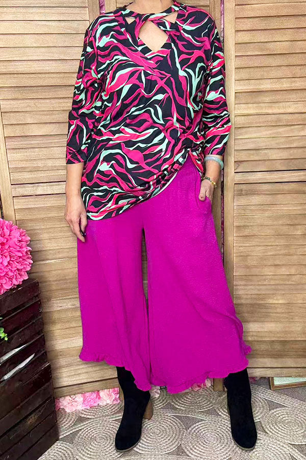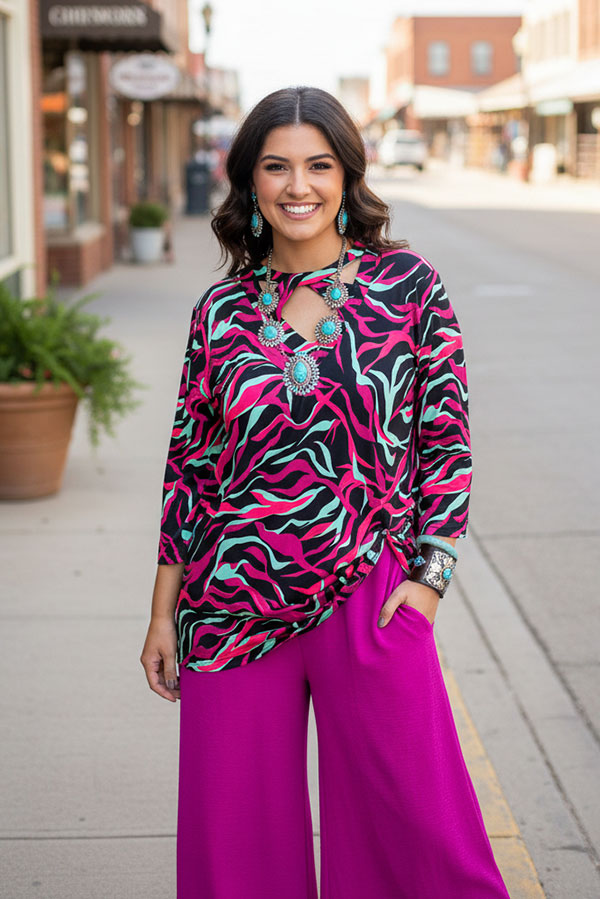 - Top features with pink black mint printed & 3/4 sleeves with criss cross neck.