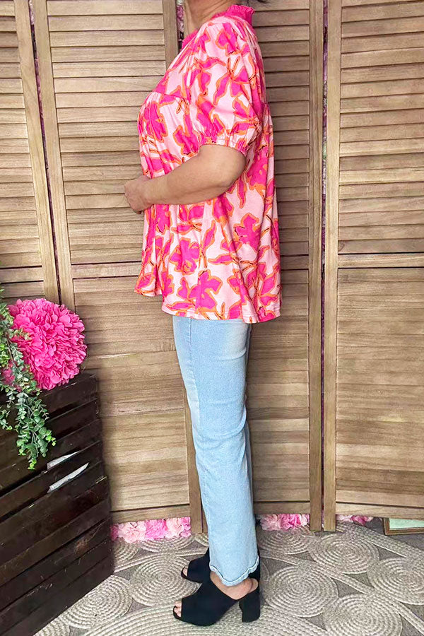 Pink floral printed puff short sleeve baby doll women blouse GJQ16188 DS6
