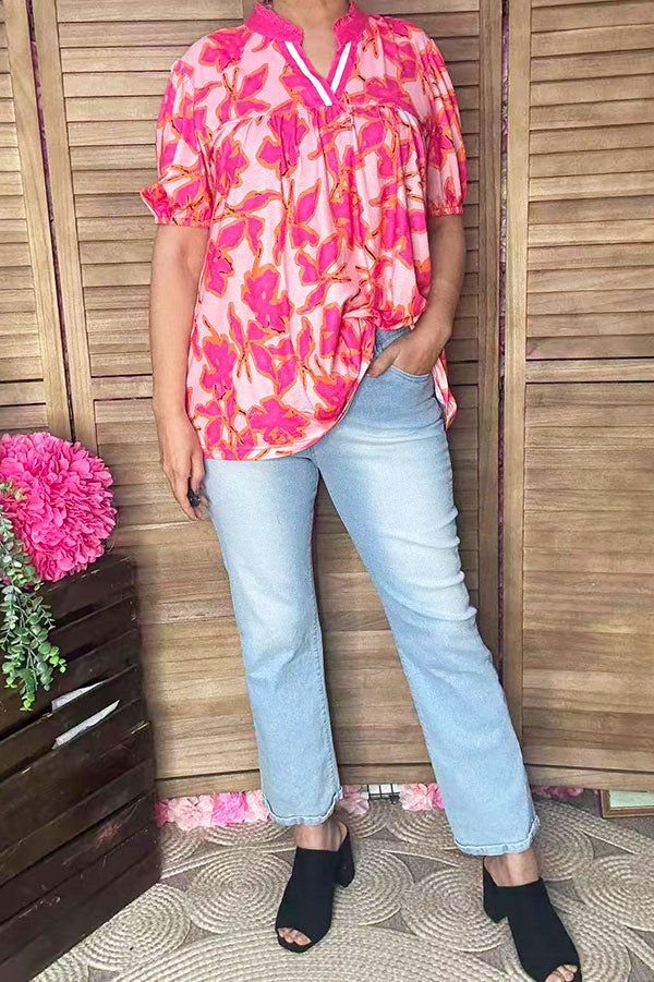 • Top features with floral printed & puff short sleeve with pink/white trim.