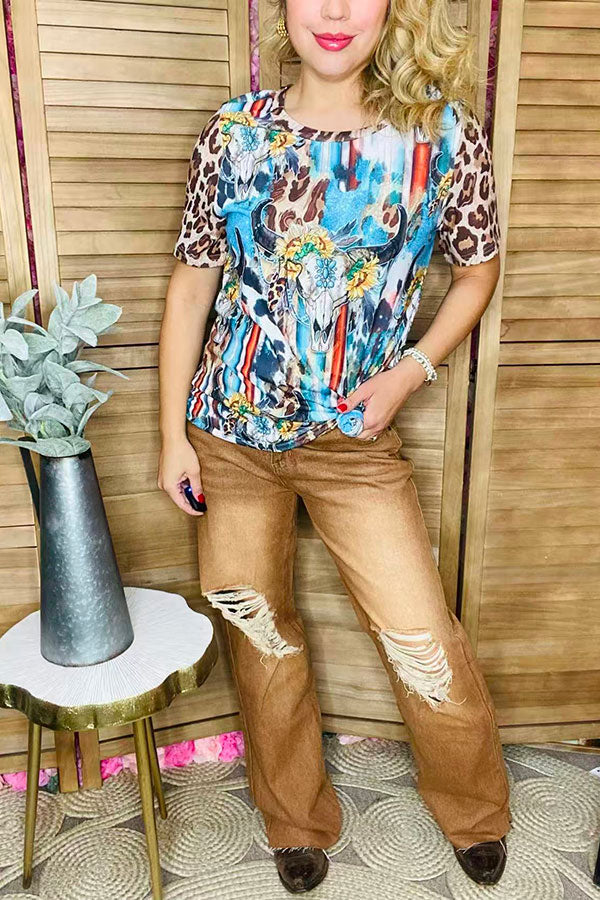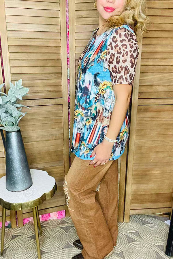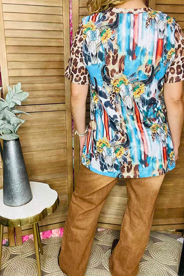 • Top features  Bull skull & sunflower multi color printed leopard short sleeve women tops