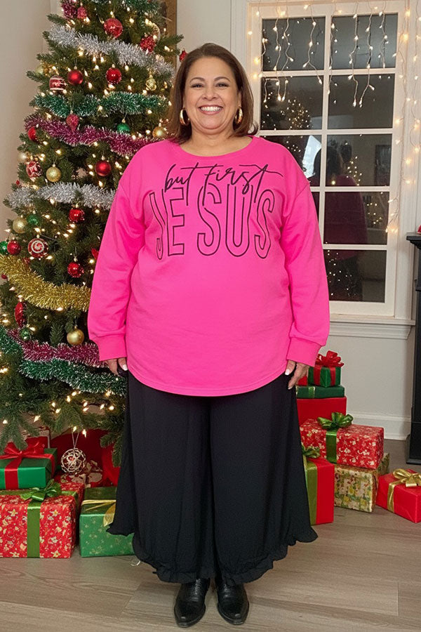 Plus size "but first JESUS" embroidery Christmas hot pink women sweatshirt XCH16561