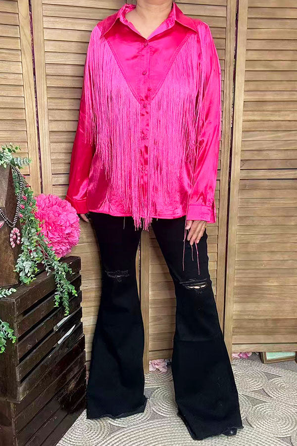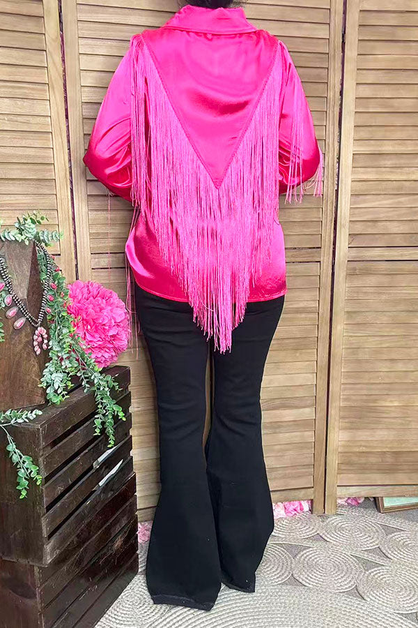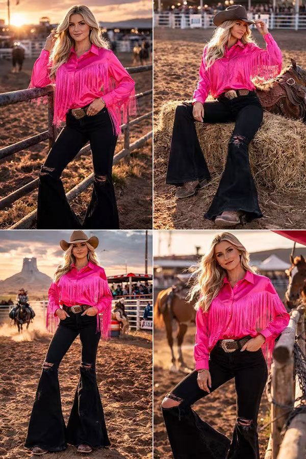 - Top features with pink button up long sleeve blouse w/fringe tassels.