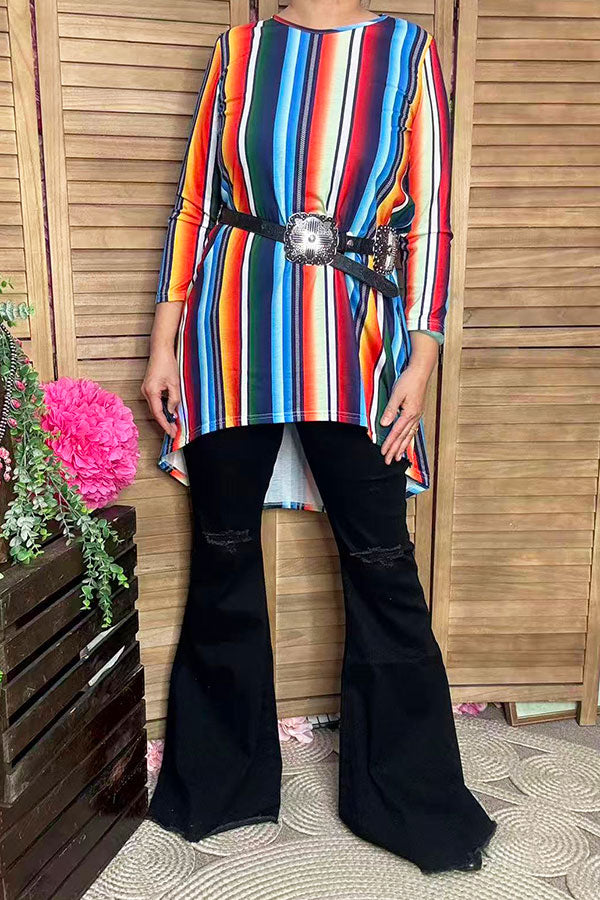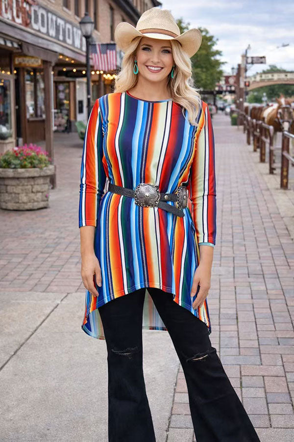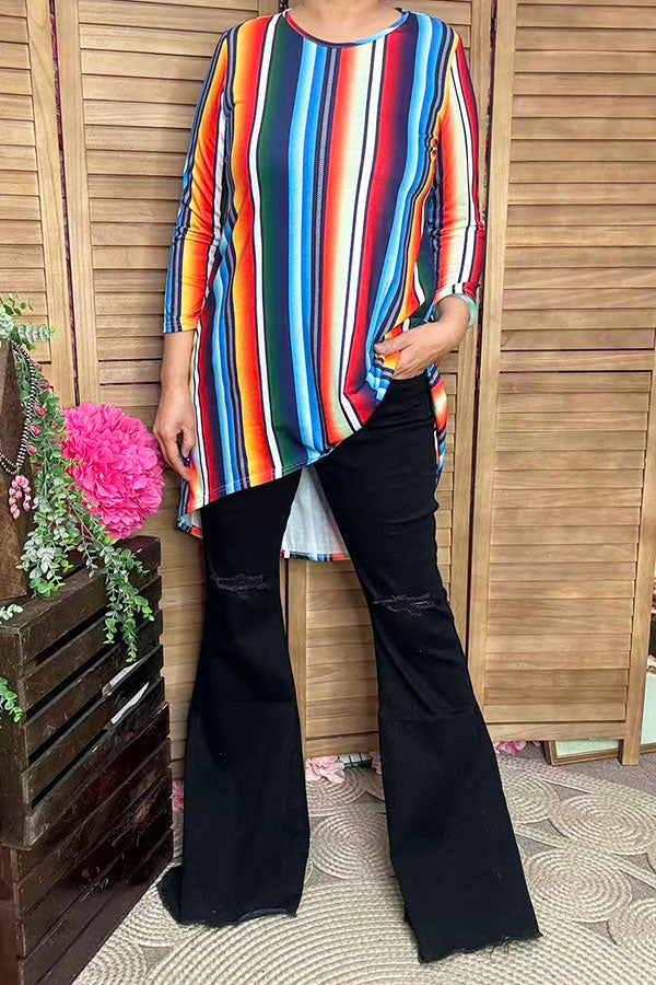 - Top features with multi color stripe printed high-low style with 3/4 sleeves.