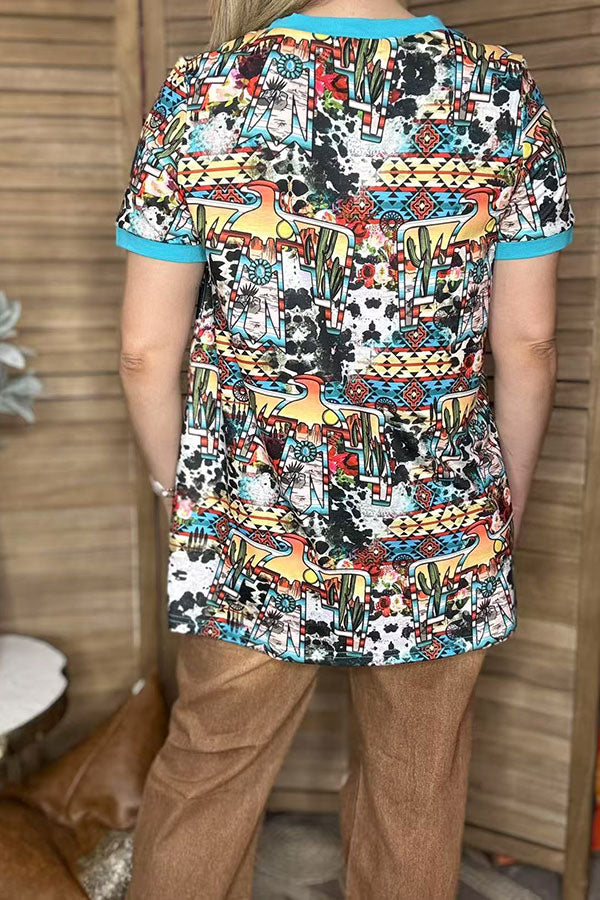 - Top features with western thunder bird & cactus printed & short sleeves & turquoise trim.