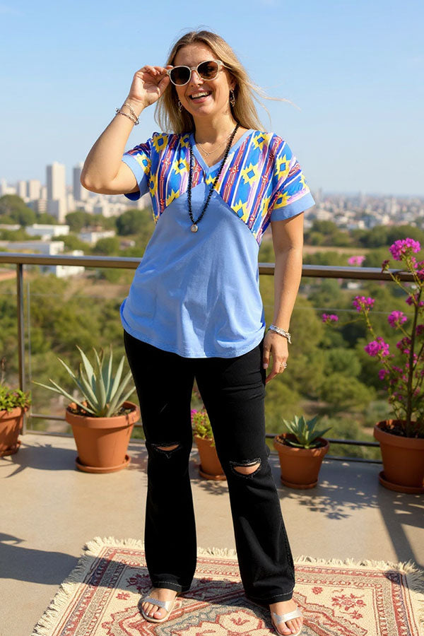 - Top features with western aztec printed with blue color block & short sleeves & v-neckline.