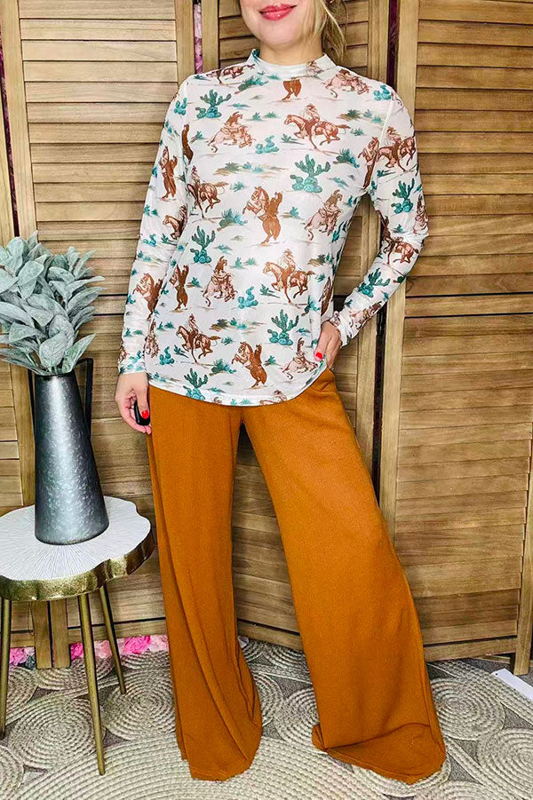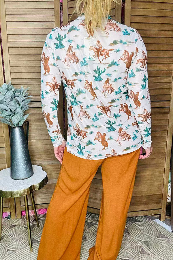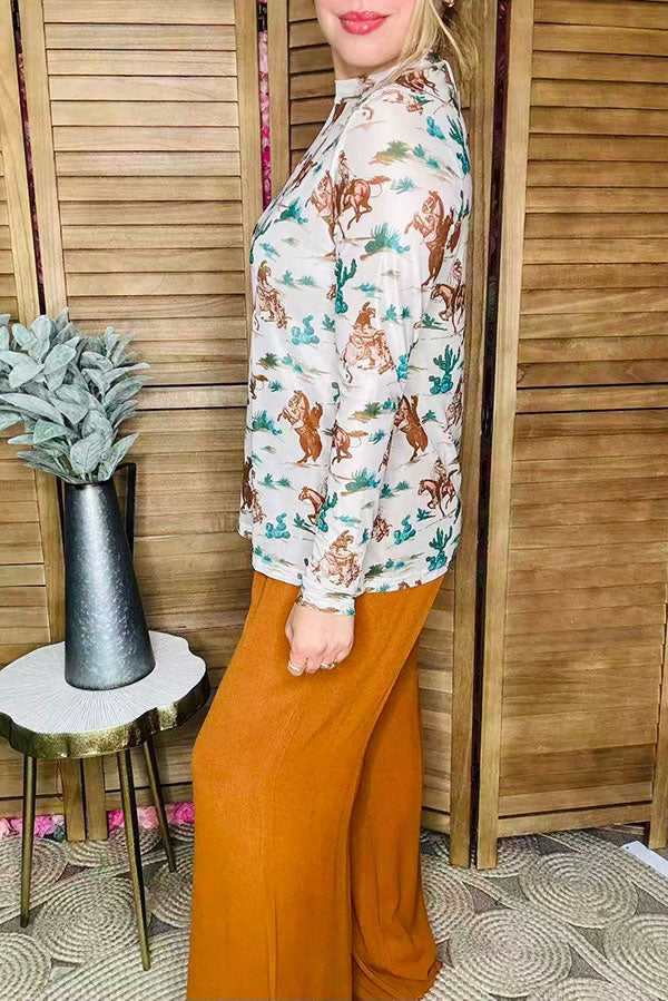 • Top features with western horse riding printed on cream background & mesh fabric & long sleeves.