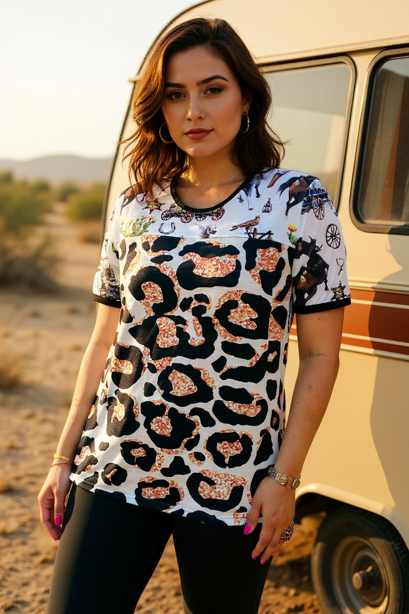 Western & leopard prints color block short sleeve women top XCH15062 IS1