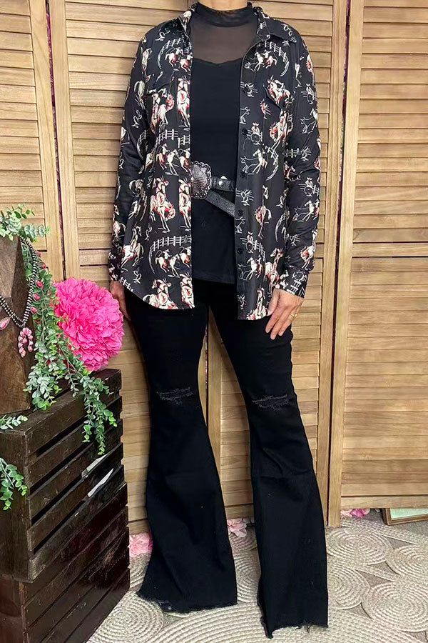 - Top features with western riding horse printed with long sleeves & buttons up.