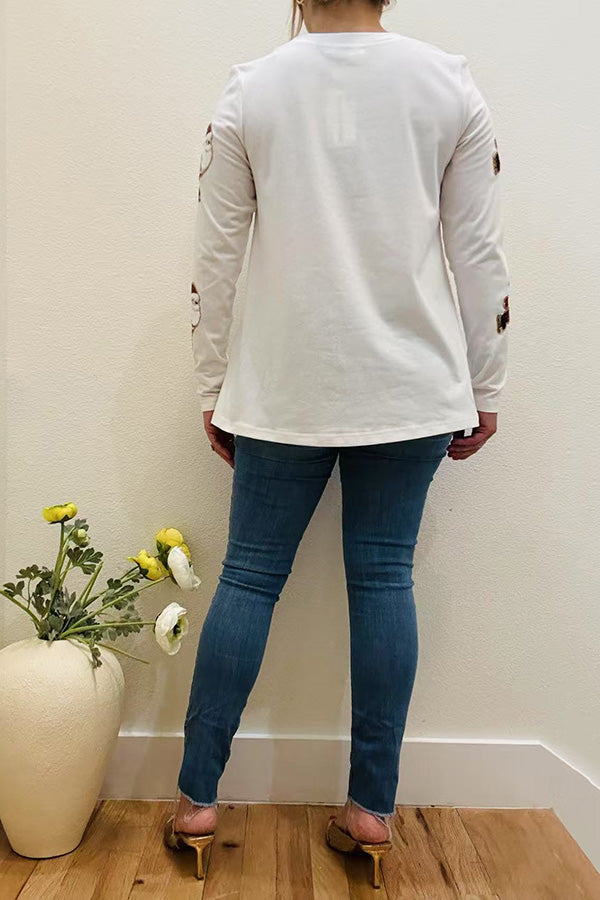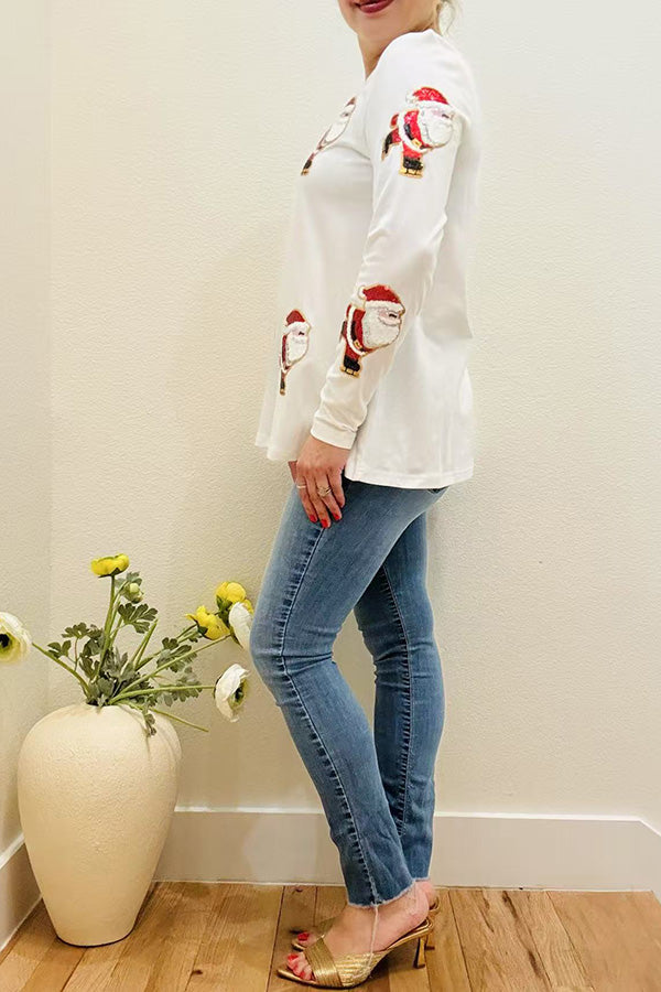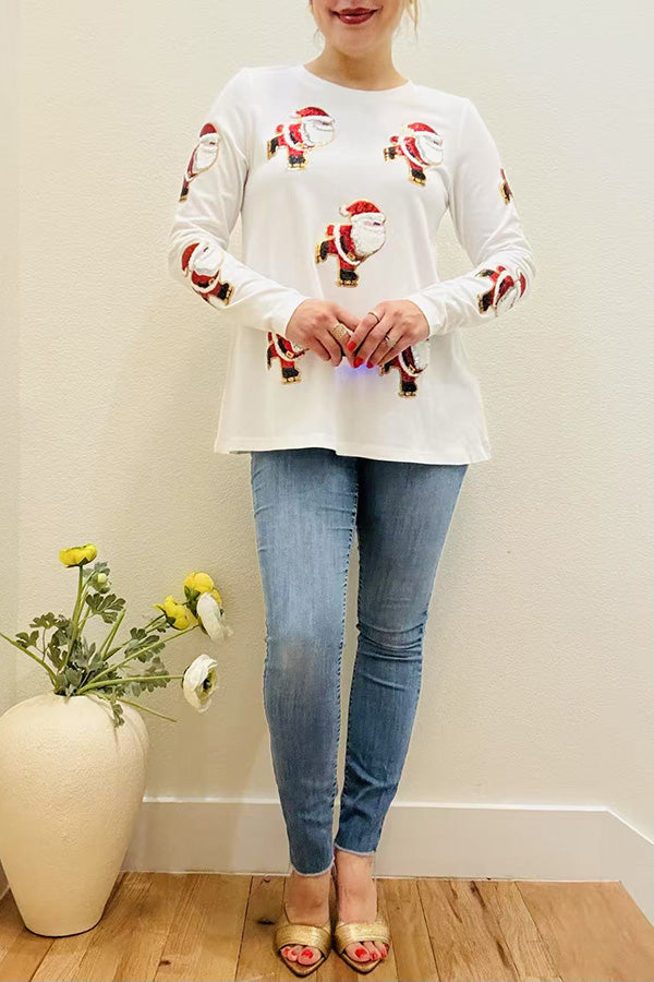 - Top features with sequin santa claus skate patterns on white background with long sleeves.