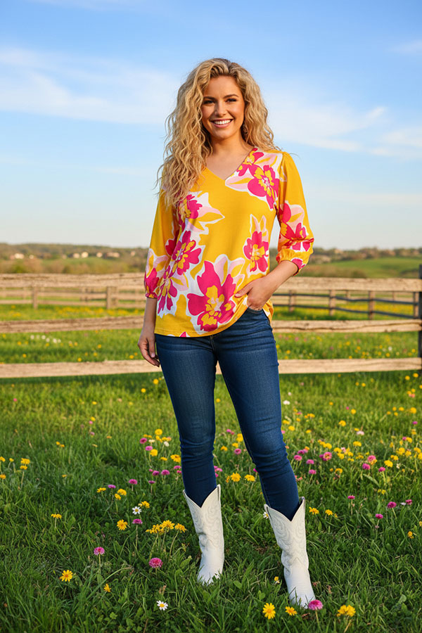 - Top features with yellow floral printed with 3/4 sleeves and v-neckline.