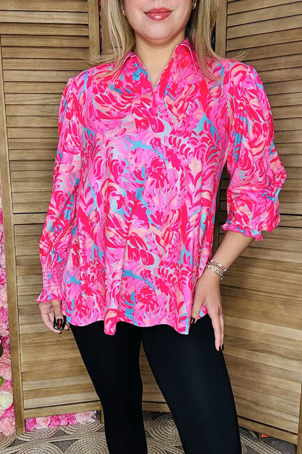 • Top features with floral printed on pink backgorund with elastic cuff long sleeves & v-neckline.