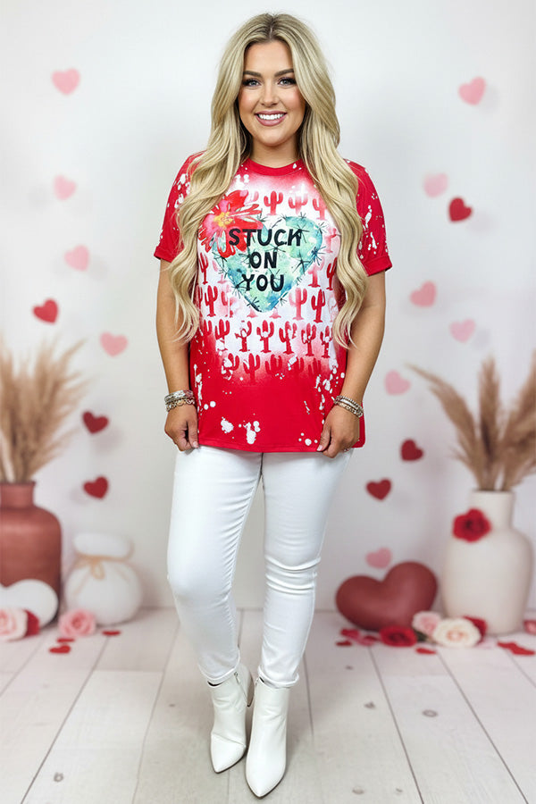 XCH14652 "STUCK ON YOU" Cactus&Heart red multi color printed short sleeve women tops