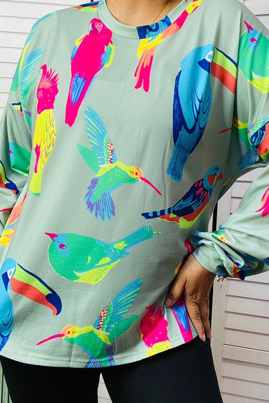 - Top features multi color birds printed on mint background with long sleeves.