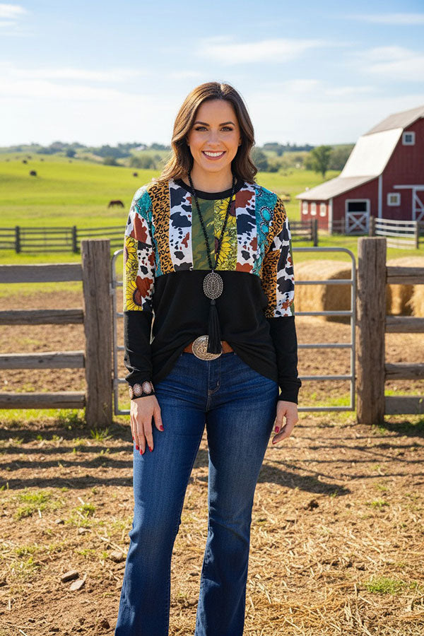 Top features with black & Animal & jewel printed color block with long sleeves.