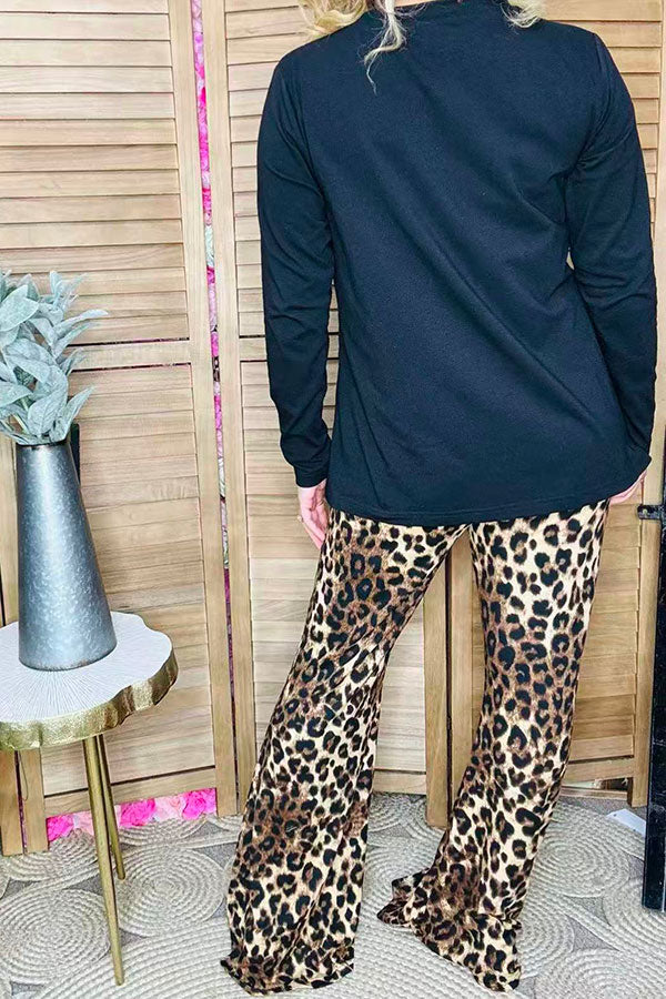 Black long sleeve top & loepard bell bottom pant 2pc women sets BQ15729(AS5)